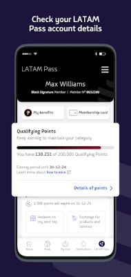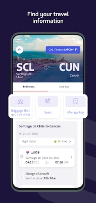 Maradjon naprakész a járat státuszával kapcsolatos valós idejű értesítésekkel, és élvezze az automatikus bejelentkezés kényelmét, mindig friss beszállókártyával a zsebében. Emelje utazását a következő szintre kabin- vagy üléskategória-frissítési lehetőségekkel. Igényeljen különleges szolgáltatásokat a még komfortosabb élményért, és nyomon követheti a kísérő nélküli gyermekek útját is valós időben, a LATAM Airlines biztosította biztonsággal. Indulás előtt ellenőrizze az utazási követelményeket, és kezelje könnyedén a visszatérítéseket is az alkalmazáson belül.